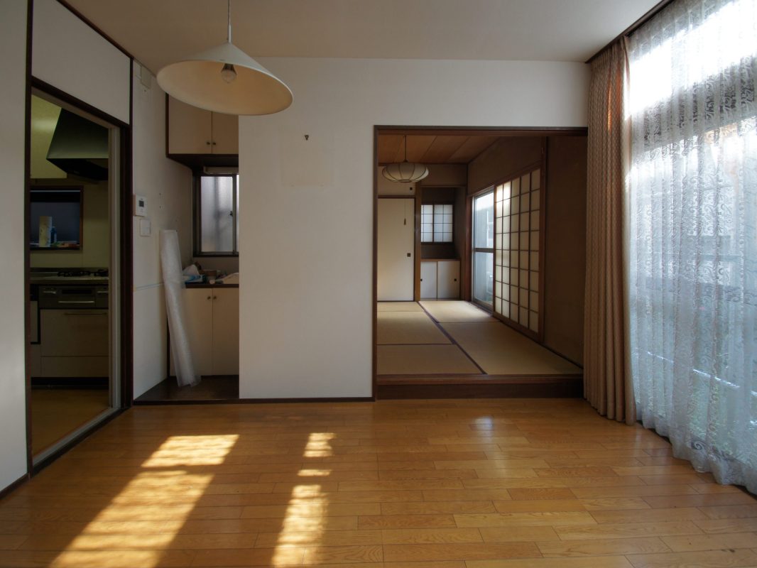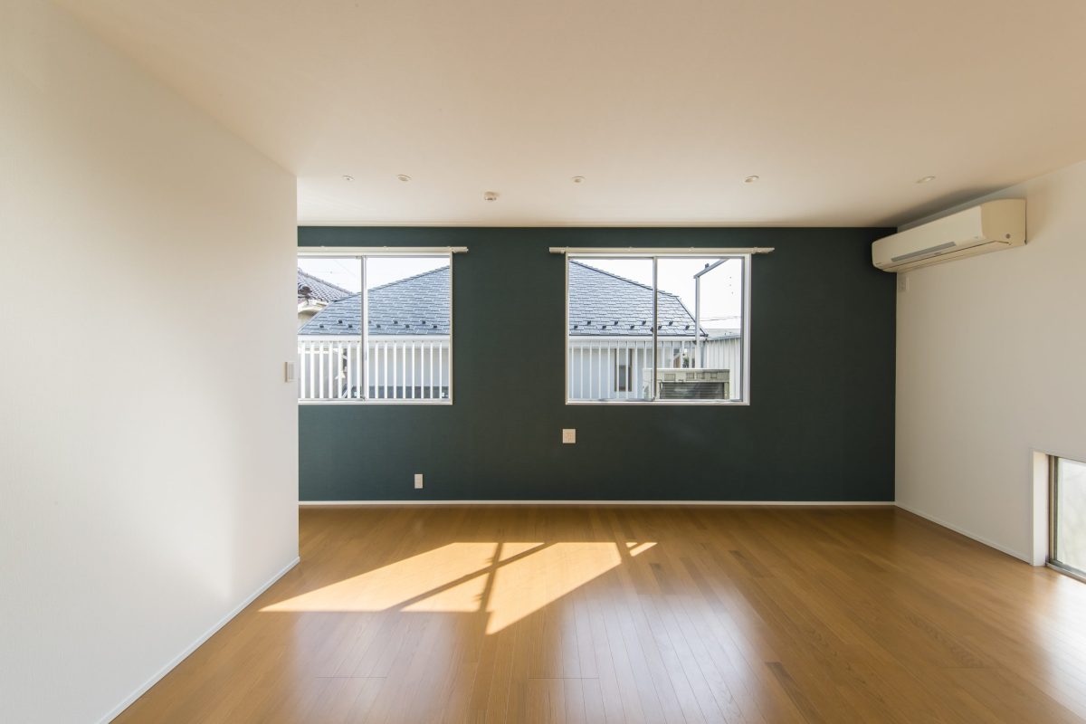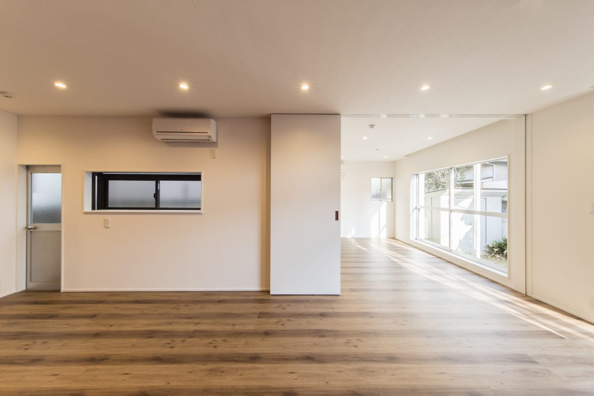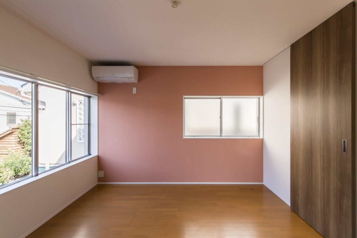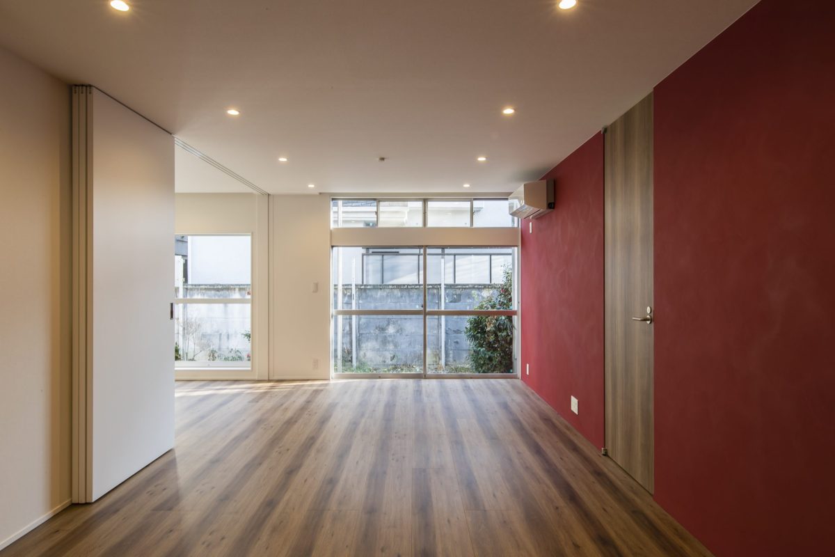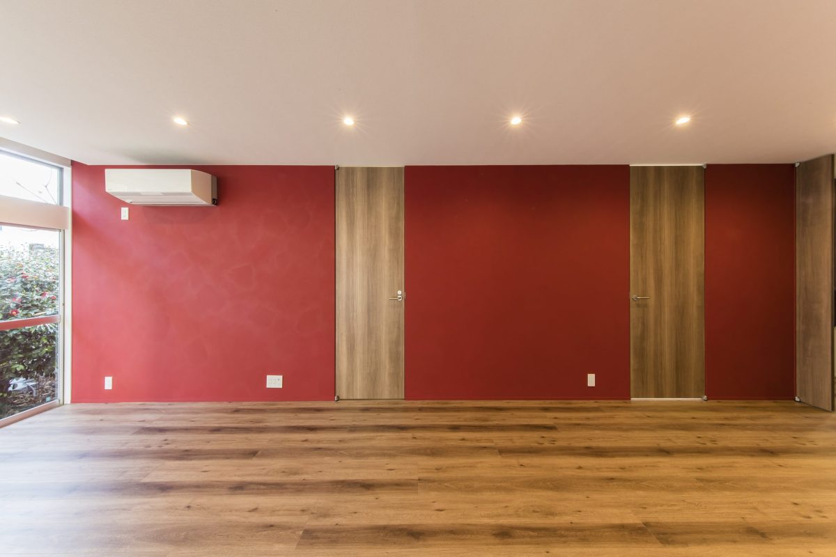 内装はもちろん、外装にも手を入れて全面的にリニューアルしました。1階は書斎、独立した台所、リビング、和室と細かく区切られていたため、構造解析を行った上で柱を抜き、梁・柱を追加して大きなリビング空間をつくりました。アクセントに壁一面にビビットなワインレッドのポーターズペイントを塗っています。将来の寝室は引き戸が完全に開くようにし、現状ではリビングをより大きく使えるようにしました。2階は大きな主寝室と客間です。間にウォークスルーのクローゼットを設け使い勝手を向上しています。