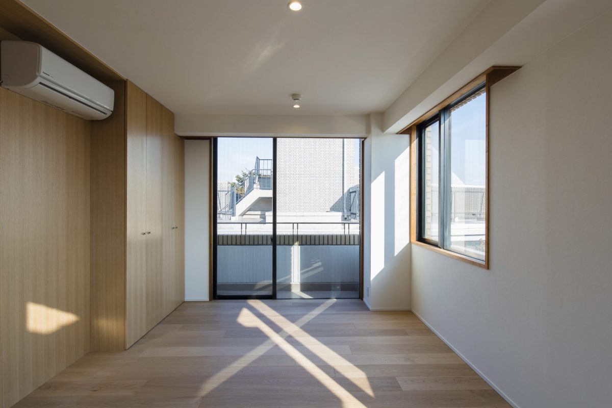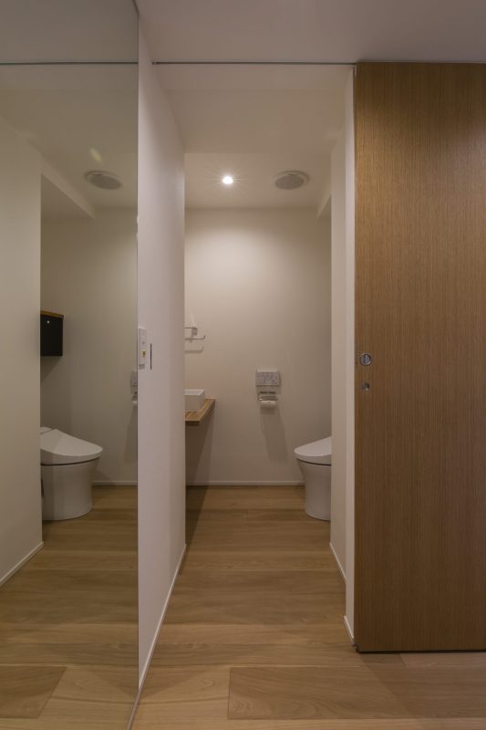 築35年のヴィンテージマンションのリノベーションです。3LDKを、LDK+寝室+納戸という間取りに変更しました。LDKと寝室は家具と引き戸で仕切り、開放感を出しています。また、廊下からLDK、寝室まで続く壁はポーターズペイントでグレーに塗装しアクセントとしました。床、家具、建具、ブラインドにはナラ材を用い、落ち着いた統一感を出しています。トイレ、浴室はもともと10cmほどの段差がありましたが、今回の工事で解消しました。